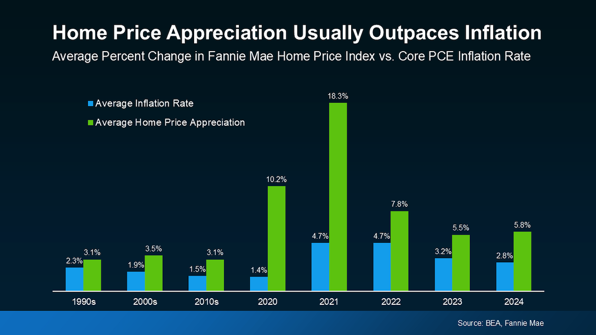 Another key reason homeownership is a great hedge against inflation is that home values tend to appreciate over time—often at a faster rate than inflation. Data from BEA and Fannie Mae confirms this trend (see graph below):