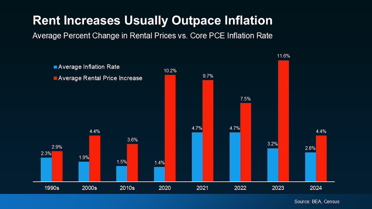 The same can’t be said for renters. Rent prices typically increase over time—and often at a rate higher than inflation. Just look at the data from the Bureau of Economic Analysis (BEA) and the Census Bureau (see graph below):
